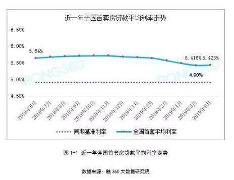 据融360大数据研究院出具的《6月房贷报告》显示,2019年6月,全国首套房贷款平均利率为5.423%,相当于基准利率1.107倍,环比上涨了0.14%。