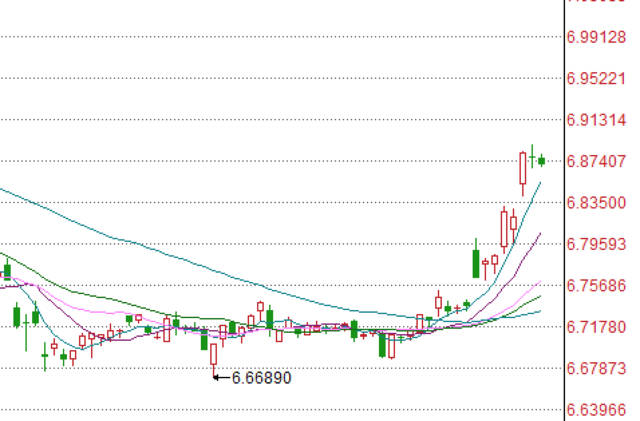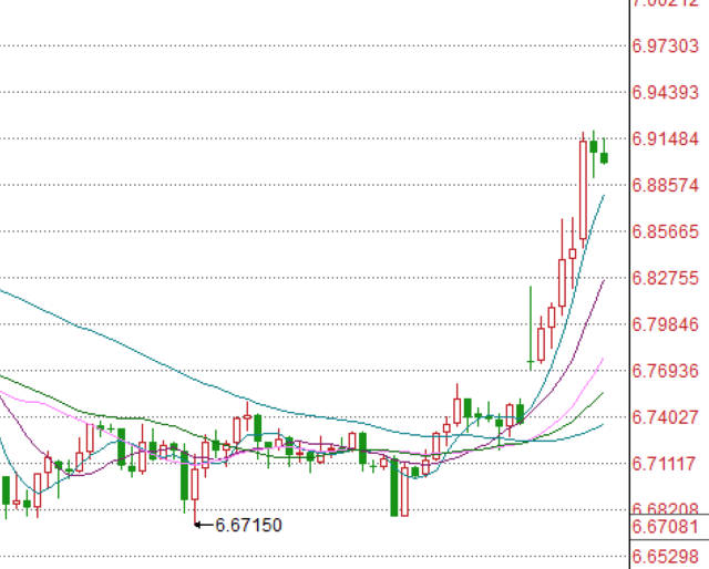 近一段时间以来,由于外部局势发生重大变化,离岸人民币的贬值预期要显著强于在岸人民币,下面是离岸人民币汇率走势图
