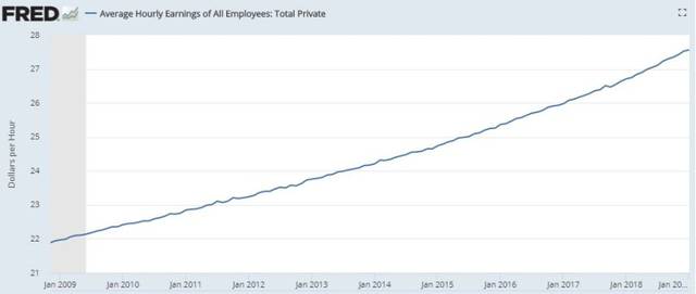 2009年1月,美国一小时工资为21.97美元,到了2019年1月,才升至27.56美元,11年时间,才增长了25.44%。