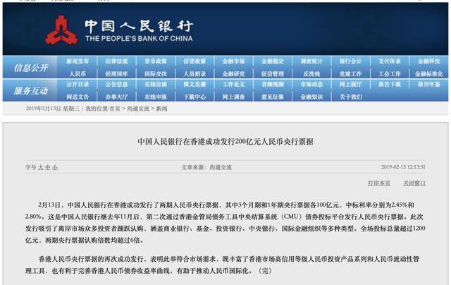 2月13日,央行在香港发行两期(3个月期和1年期)人民币央票,各100亿元,中票利率分别为2.45%和2.80%。这是央行史上第二次在香港发行央票,上一次是去年11月,传递重要信息!