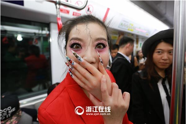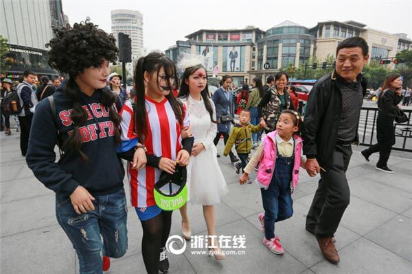 杭州10月30日讯(浙江在线记者 张迪 摄)万圣节马上就要到了,大家有准备开洋荤吗?是要扮成殭尸、吸血鬼、性感小护士鬼还是狼人呢?今天杭城街头就出现了一群化妆爱好者,发挥惊悚创意,演绎各种妖魔鬼怪,展现非凡创意和超强的化妆技巧——结果,要去吓人的人成了被合影的人。