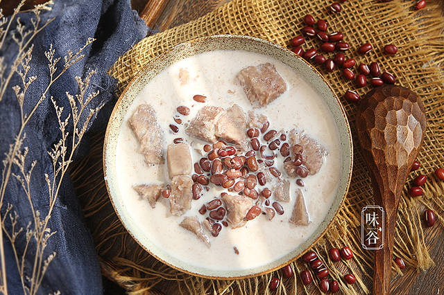 材料:红豆 60克、芋头 120克、牛奶 1瓶、冰糖 适量