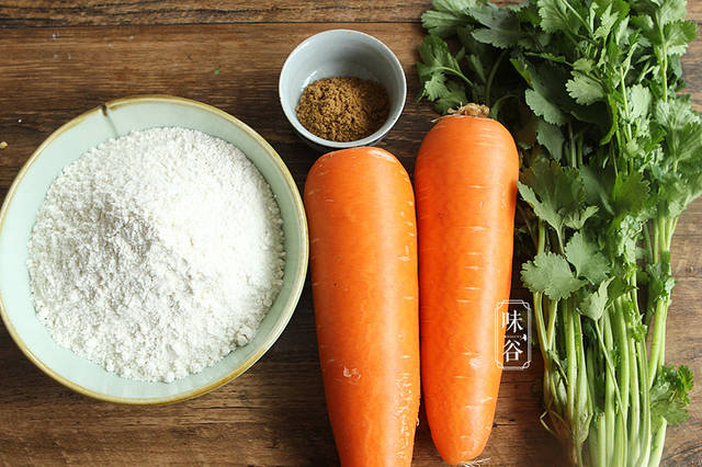 【材料】:胡萝卜 2根、香菜 1把、十三香粉 1汤匙、面粉 200克、盐 1茶匙