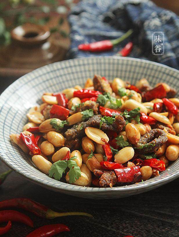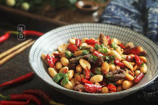 【材料】:牛肉 半斤、熟花生米 半包、椒盐 2小匙、淀粉适量、糖 1勺、酱油 1勺、料酒 1勺、油 1小勺、