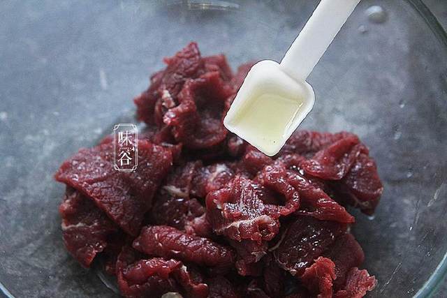 【做法】:1、牛肉切成簿片后,放入1小勺油;
