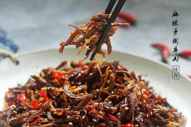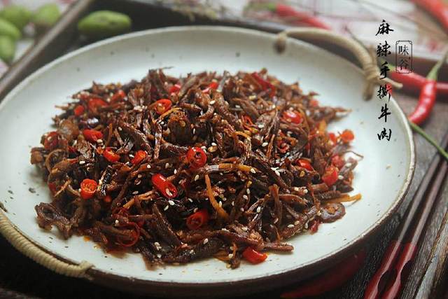 手撕牛肉是许多吃货们的的必备零食之一,外面卖的包装牛肉虽然看起来好吃,但大都含有添加剂和防腐剂,吃起来总有些不放心,不如自己动动手,绿色天然无添加!牛肉手撕后丝丝可见,而且有嚼劲,色泽诱人,口齿留香!完全停不下来……而且相比一般的手撕牛肉干,麻辣手撕牛肉丝不仅可当零食吃,还可以是下酒菜、下饭菜。