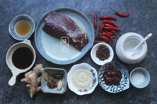 【材料】:牛前腿肉 300克、小米椒 14个、姜 40克、花椒 10克、大料 适量、糖 1匙、盐 1小匙、豆瓣酱 1大匙、生抽 2大匙、料酒 1大匙、芝麻 适量、
