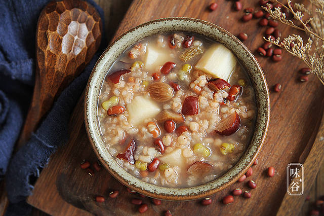 【材料】:山药 适量、糯米 40克、大米 40克、高粱米 20克、红豆 1把、绿豆 1把、红枣 6颗、葡萄干 20克、冰糖 适量