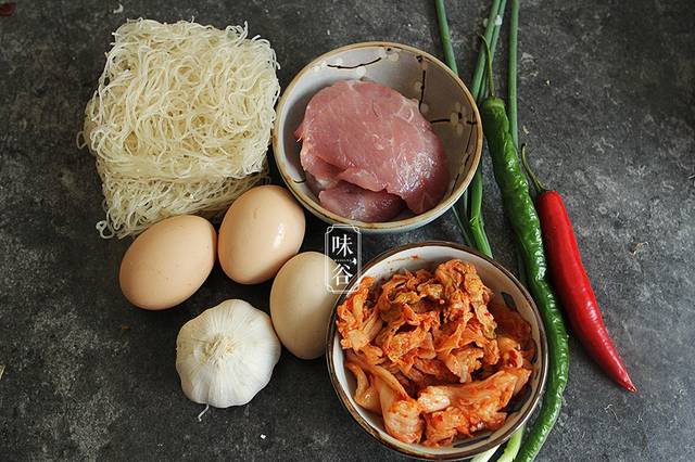 【材料】:鸡蛋 3个、米粉 2块、瘦肉 80克、青椒 1根、红椒 1根、泡菜 适量、蒜 适量、蚝油 2大勺、盐 半茶匙