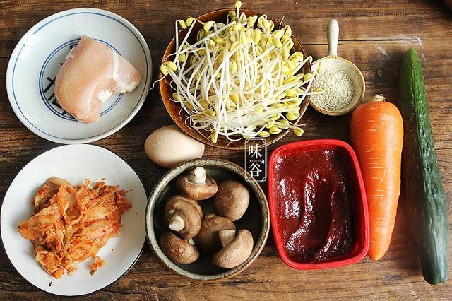 【材料】:鸡胸肉 半块、豆芽 1把、泡菜 1把、青瓜 少许、胡萝卜 半根、香菇 6朵、鸡蛋 1个、韩式辣酱 适量、熟芝麻 少许、白糖 1小勺、