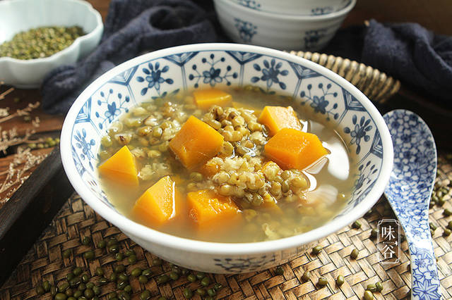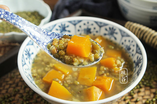 对于绿豆,我们大家都知道夏天的时候适当的喝点绿豆汤能够消除暑气,而且绿豆当中含有丰富的蛋白质以及维生素,具有清热解毒,消暑除烦,止渴健胃,利水消肿之功效。而南瓜具有降糖降压、排毒养颜、强身健体、健脾胃的功效;南瓜和绿豆搭配熬汤,可以起到解暑化湿、清热祛火、生津益气等食疗效果,比纯粹的绿豆汤多了些南瓜的软糯清甜,两三块钱煮一锅,是夏季防暑最佳膳食。而且南瓜本身还有很好的润肤的功效,尤其女性朋友们常吃不但清热解暑,还能滋养肌肤,比单喝绿豆汤要好很多。