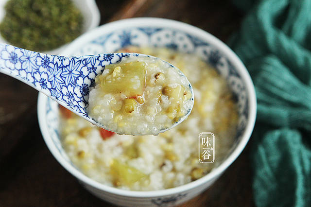 在夏季最常出现的莫过于绿豆粥,其实熬粥时加上西瓜皮、玉米渣等,食疗效果更丰富,具有清热解暑、利尿消肿作用,常食可防中暑。西瓜皮的作用和美味不逊色与西瓜瓤,甚至略胜一筹,西瓜皮是中药西瓜翠衣的来源,也是夏季家庭版的“祛暑良药”,瓜皮中含有大量的瓜氨酸,有消暑利尿、美白的作用。而且西瓜皮还有一种天然的清香,熬出来的粥光是闻着就很有食欲,喝起来口感也很美的。
