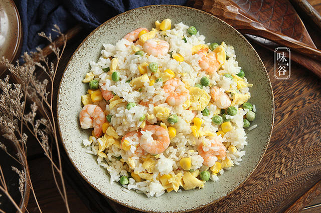 生活中我们常常会碰到家里有剩饭, 每次家里有剩饭,让人很头痛,再热一次吧,感觉没有刚煮熟的好吃,丢掉吧,担心长辈说败家子……不如花上点的时间,把家里所有现成的食材一起动员起来,做道色彩缤纷的炒饭来填饱家人的肚子吧。我推荐做这道豌豆玉米虾仁炒饭,做起来很省事儿,红红绿绿的搭配,小孩子一看就喜欢,而且虾仁是低脂高蛋白的健康食品,富含矿物质,米饭提供碳水化合物,各色蔬菜又是维生素和矿物质的绝佳来源,营养丰富,一碗还不够吃的感觉。