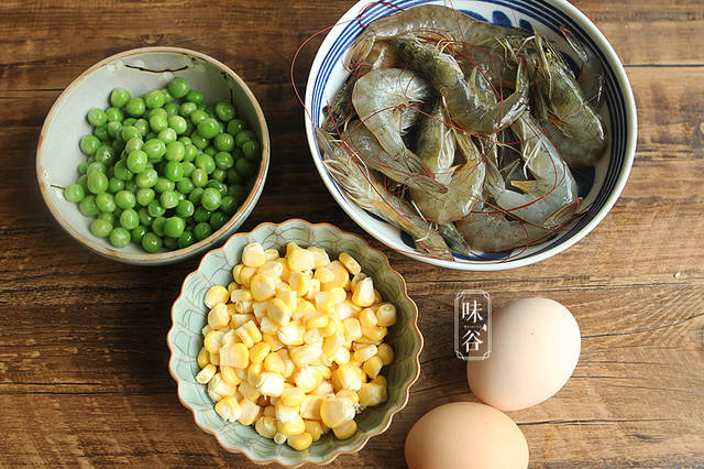 【材料】:虾仁 适量、豌豆 适量、玉米 适量、胡椒粉 少许、料酒 1勺、鸡蛋 2个、盐 适量