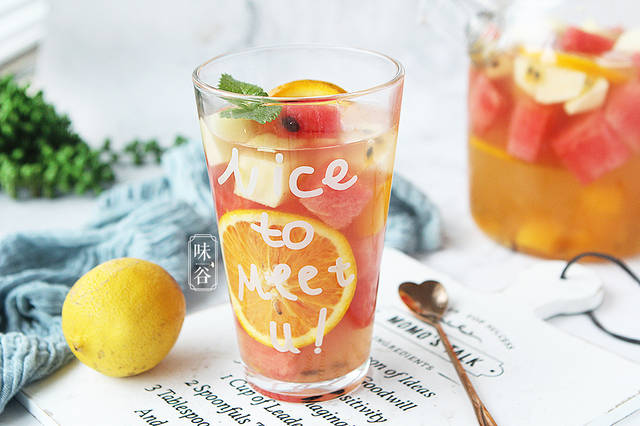 【材料】:西瓜 适量、芒果 1个、百香果 1个、柠檬 1个、苹果 1个、橙子 1个、红茶 10克、冰水 1 瓶、蜂蜜 适量(其他水果可以随个人喜欢加入)