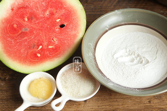 【材料】:西瓜 半个、糯米粉 100克、白糖 40克、蜂蜜 适量