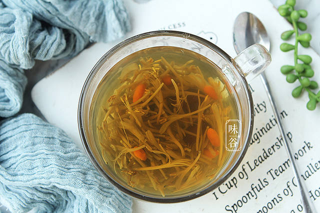 【材料】:红枣 8颗、甘草 3片、陈皮 1小块、枸杞 1小把、金银花 10克、冰糖 适量