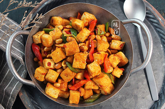 豆腐含有丰富的营养,做法也多种多样,像麻婆豆腐、肉末蒸豆腐……不过今天我做的却是宫保豆腐丁。这是传统的宫保鸡丁演变出来的一道菜。将鸡肉换成了豆腐,外焦里嫩,吸收了汤汁的豆腐格外有味,再配上花生米,色彩绚丽,微辣中带着一点豆腐的香味,还有花生米的香脆,下饭又下酒,小小一盘家常素菜绝对不输任何一道肉菜大餐,绝对是素食者的心头好。