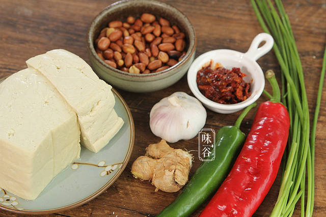 【材料】:老豆腐 2块、花生米 一小碗、豆瓣酱 1大匙姜蒜 适量、青红椒 各1根、香葱 适量、生抽 1汤匙、淀粉 1茶匙、料酒 1汤匙、白糖 1茶匙