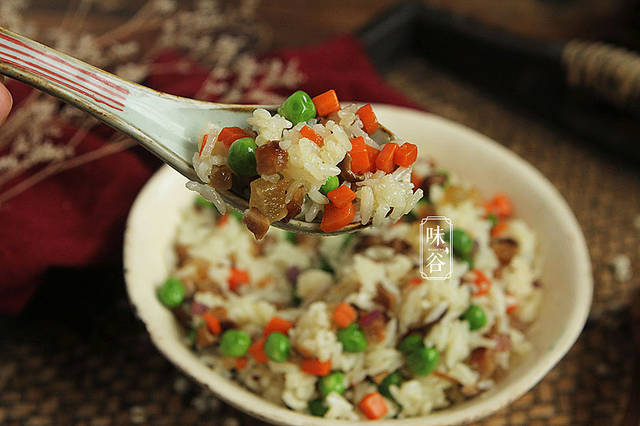 【材料】:糯米60克、大米 60克、豌豆 1小碗、胡萝卜 半根、腊肉(或咸肉) 100克、洋葱 适量、干香菇 5片、盐 少许