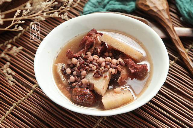 今日推荐大家要常喝这赤小豆薏米粉葛汤,材料有猪扇骨,薏米,粉葛和赤小豆。 薏米的祛湿功效想必大家早有耳闻,而此汤里的赤小豆非红豆,赤小豆黑红并且瘦长,虽然和红豆都有健脾的功效,但赤小豆的祛湿功效更强。所以药膳煲汤最好用赤小豆,因为赤小豆本身是可以入药的。粉葛又称为葛根,可清热、去骨火,而且粉葛的纤维丰富,连汤同吃有助清理肠胃。三者合一,清热下火、祛湿润燥,实为老少咸宜的靓汤。
