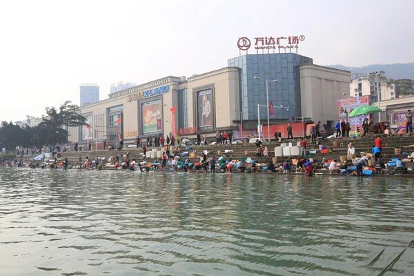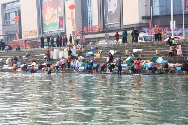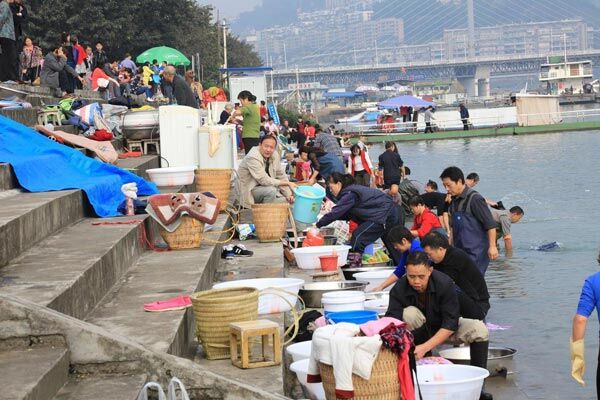 2015年11月1日,长江三峡水库成功实现175米蓄水目标后,重庆市万州港水位上升,市民纷纷来到长江万港江边码头一边洗衣服一边欣赏平湖美景。这是三峡工程连续第六年成功完成175米试验性蓄水。