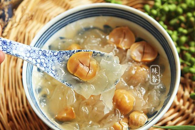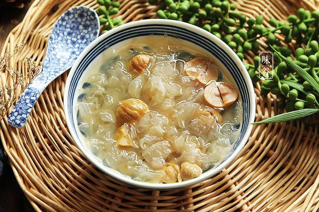 这银耳是个好东西,银耳含有天然的植物性胶质、脂肪和多种氨基酸、矿物质,有“菌中之冠”的美称。春季多吃银耳,可以滋阴润肺,提高肝脏排毒功能,增强机体免疫力,还可以补充胶原蛋白,对皮肤角质层有良好的滋养和延,缓老化作用,故具有美容的作用。栗子是一种补养治病的保健品。它营养价值丰富,所含的维生素C比公认含维生素C丰富的西红柿还要多,更是苹果的十多倍。能供给人体较多的热能,并能帮助脂肪代谢,具有益气健脾,厚补胃肠的作用。与银耳搭配起来也很美味,深受大家的喜爱。