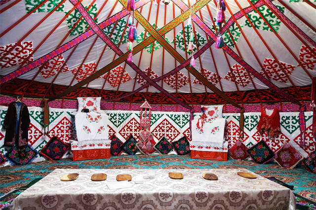 哈萨克族是一个古老的游牧民族,哈萨克毡房是以游牧为主的哈萨克族,逐水草而迁徙,一般在春、夏、秋三季住一种易于支撑和拆卸的毡房,走进毡房,可以感受到浓郁的异域风情,毡房内四周是挂壁,地上是花毡,各种幔帐都是刺绣艺术品,使人赏心悦目,仿佛置身于艺术殿堂。