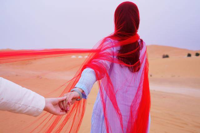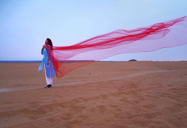 在大沙漠拍照,因为比较空旷荒凉,还是要自己准备一些小道具,一条足够长却又很轻薄的长纱,就可以给照片增加很多亮点,我去的时候,带了红色和白色,发现还是红色的拍出来效果好。