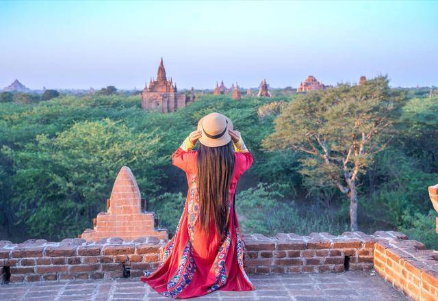 缅甸蒲甘,当坐在佛塔上看日出的时候,可以背对镜头背影和前方的风景,也是一幅好看的画面,拍照不一定非要正面出境,这样意境悠远的照片,,反而会留下更深刻的印象。