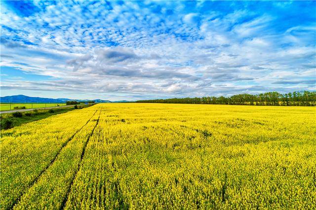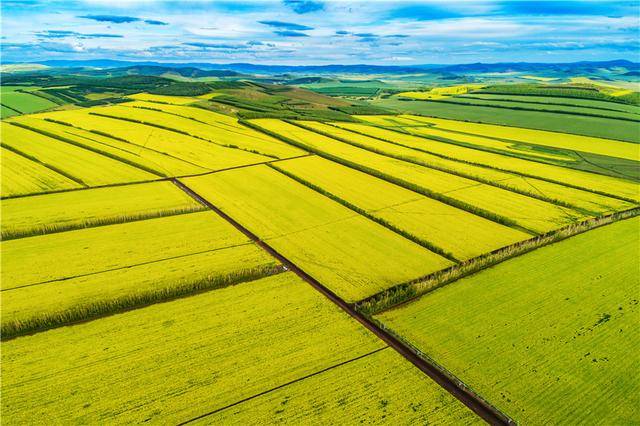 沿着公路飞驰,眼前就是无边无际的油菜花田,和连绵起伏的群山,相互辉映成一道呼伦贝尔特有的风景线。
