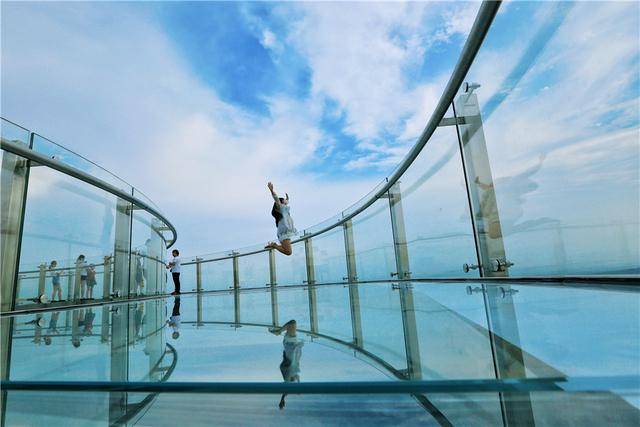 当夕阳静静地洒在伏羲山红石林的环形玻璃栈道上时,山间微凉的风吹动衣衫飘飘,莫名让人有了想飞奔想跳跃的快乐,玻璃栈道下面,清晰可见脚下是一座座绿色的山峰,极目远眺,呈现在眼前的是连绵起伏的山峰,红石林特有的丹霞地貌,让看到的一切色彩分明,而山间时隐时现的公路,急速飞驰的车辆,都让人觉得新奇而壮丽。