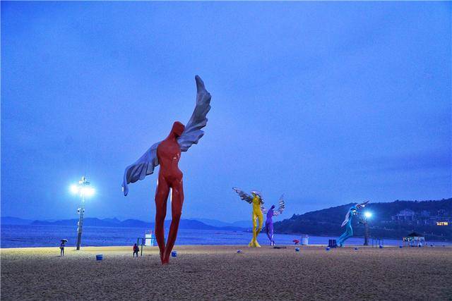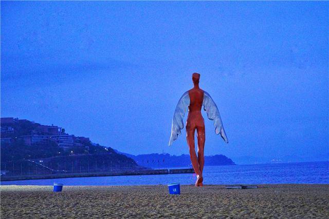 在夜色将阑时分抵达大梅沙,因为小雨,海边的人并不多,海和天依然呈现一种澄澈的蓝,让我这个北方来的人感觉很是特别。沙滩上的天使塑像,在这片蓝色的映衬下,越发显得沉静。