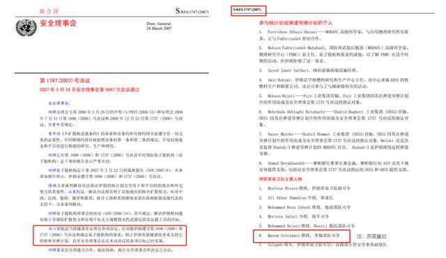可是没想到奥特加斯的观点没能经得起考验,翻车速度之快令人瞠目结舌。笔者在联合国网站公开的资料中找到了这份联合国安理会第1747号(2007)决议,决议中明确指出,苏莱曼尼作为伊朗军方的关键人物被列为国际制裁对象,而并非恐怖分子。