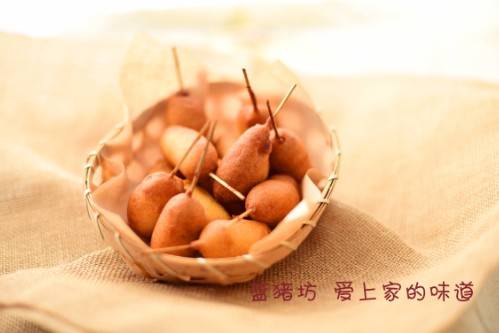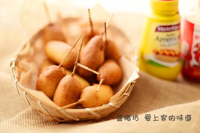 在制作之前先给大家小小的科普一下热狗,热狗是香肠的一种吃法,有夹着面包三明治食用,还有的是直接食用,热狗的种类比较多,加起司的叫做“起司热狗”,今天我们做的这种查根小竹棒的叫“玉米狗”在台湾地区有的时候也被叫做热狗,制作完成后直接食用或者蘸料、酱汁食用都可以。