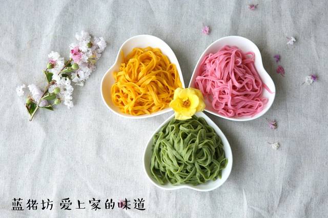 今天给大家推荐的是适合全家人和宝宝一起吃的彩虹面条,颜色鲜艳,观赏性和实用性都很高,并且里面的颜色都是用了蔬菜汁,没有使用任何添加剂,是非常安全的一款面条。