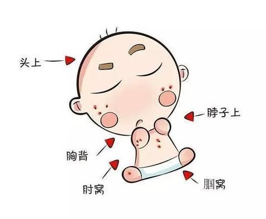 痱子是因为皮肤出汗没有及时蒸发造成的。容易出现在:脖子,腋下,大腿根,屁屁和后背。