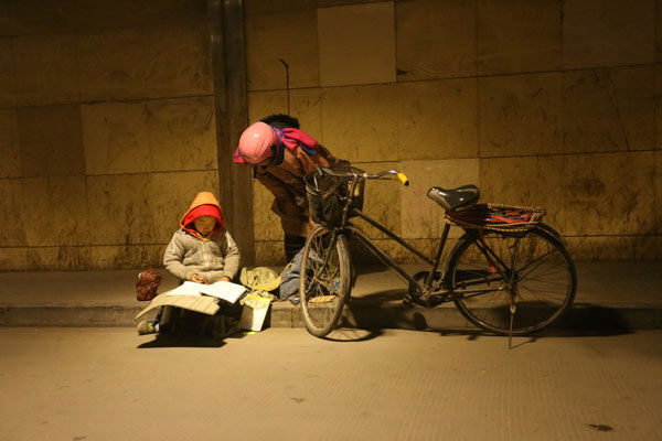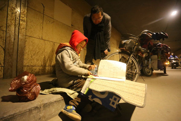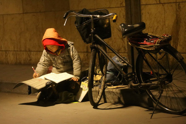 2015年11月8日晚,郑州中原路京广铁路大桥下涵洞的马路牙子边,一位戴着红色辣椒帽的小男孩趴在一个小马扎上,上面铺着一张车垫,在微弱的灯光下写作业,面前是川流不息的行人和滚滚车流。据悉,这个小男孩名叫李一航,今年7岁,老家许昌,在附近的一个小学读一年级,父母在旁边摆地摊卖挡风被,每天他都要陪父母等到深夜11点左右才能回到住处,困了就躺在路边席地而睡。