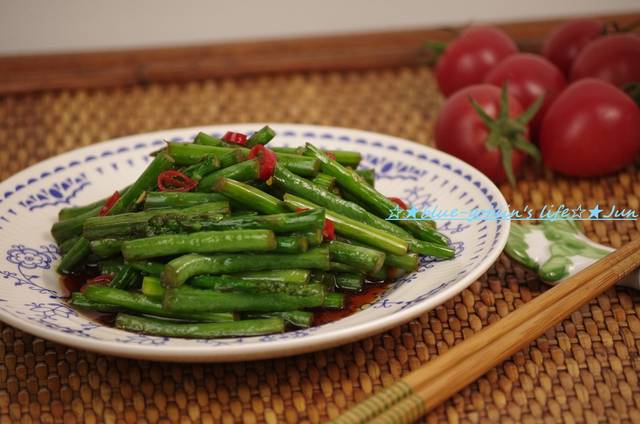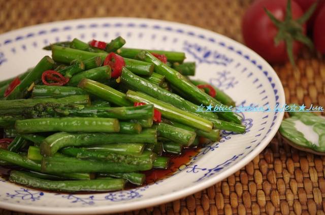 材料:豇豆6根,细芦笋20-25根,酱油3勺,食用油1勺,小红辣椒1个做法:1,豇豆和芦笋切成5cm长的段,烧一锅热水加入一点盐和一点食用油(都是分量外),下豇豆和芦笋分别焯水2,准备一盆冰水(分量外),下入焯好水的豇豆和芦笋,这样能保持颜色鲜艳,小红辣椒切碎3,炒锅烧热,加入食用油,下入芦笋和豇豆段,翻炒均匀,加入辣椒碎,然后烹入酱油,就好了