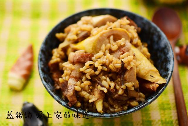 大米200g,春笋300g,五花肉丁100g,葱花姜末10g,橄榄菜50g,生抽5g