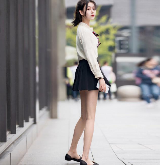 好长时间没介绍过这么有学生气的装扮了,先来看这款衣服,上身是一个有着娃娃领,还有袖口收紧的米色上衣。这个上衣的材质,像是衬衫的那种布料,娃娃领还有前面红色蝴蝶结的设计,显得非常可爱。但这个蝴蝶结,并不是我们日常看到的那种特别经典的,但是有了金属圆环,还有红黑两色的交织,时尚和特别了不少。下身是一个超级百搭,而且适合清纯女孩子的黑色百褶裙。