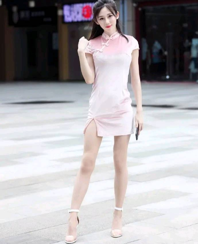 白皙美女,粉色旗袍,凸显性感大长腿。