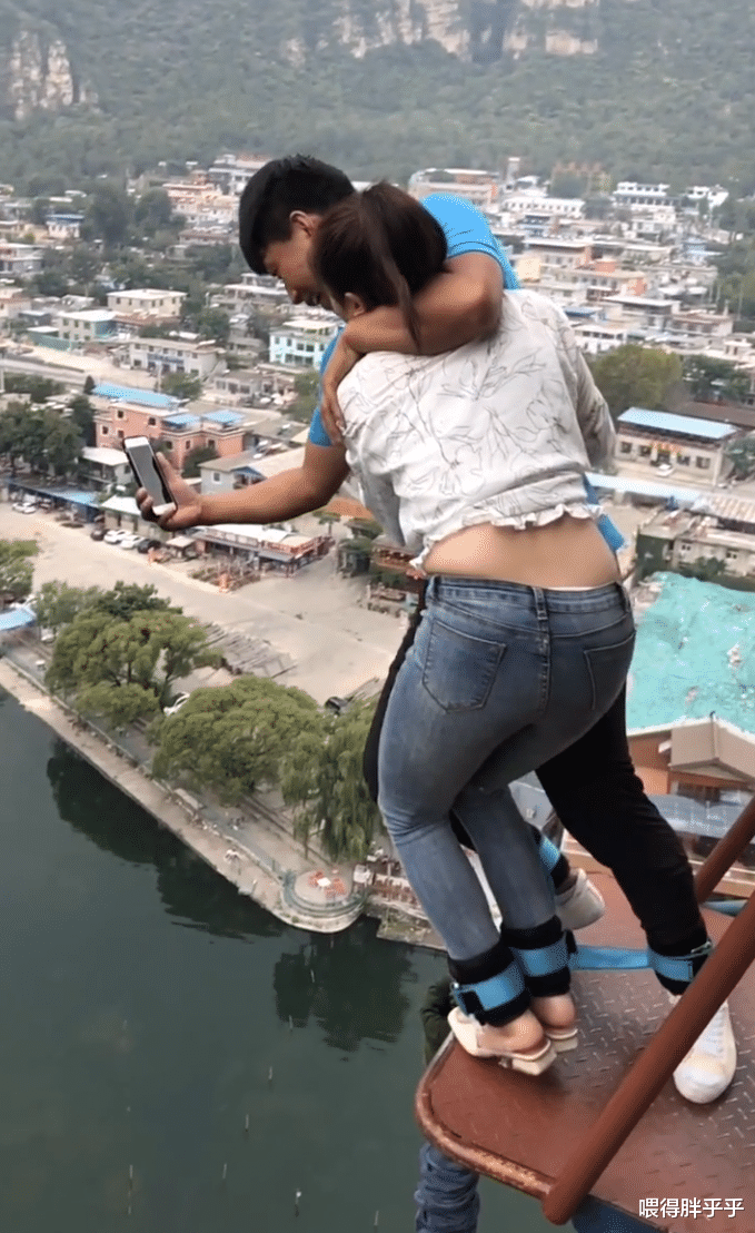 看两个人蹦极的时候,小哥哥紧紧的抱住小姐姐,看起来应该是真爱啊,这样的小哥哥还真的是不常见的,感觉看起来小姐姐的身材并没有那么好,但是小哥哥还能这么的喜欢他,应该是一个不在乎外貌也不在乎身材了。这果然是真爱了。