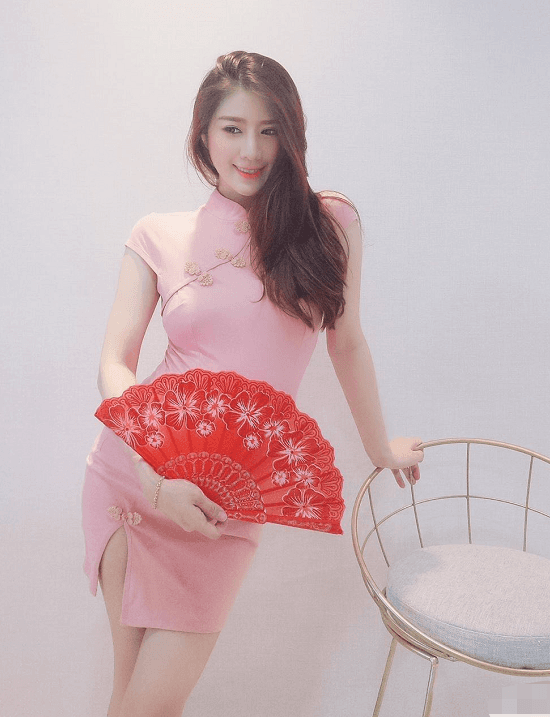 这位女生首先穿了一件红色的旗袍,这件红色的旗袍款式比较短。这件旗袍的款式虽然比较简单,上面只有几个简单的盘扣,但是这个颜色非常喜庆。像这样的衣服是很适合在春节期间穿的。这位女生在手里拿着一把红色的扇子,与她这套衣服十分搭配。
