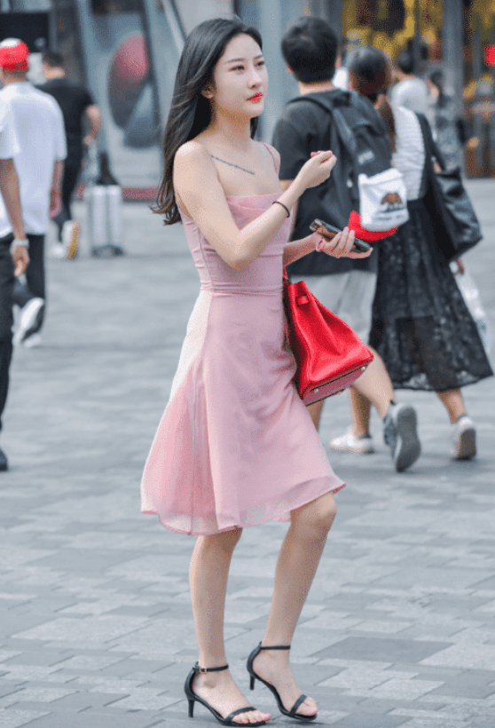 美女穿着一身粉色吊带连衣裙,裙子修身设计让美女露出了纤细的腰身。吊带的设计让美女露出了精致的锁骨,小露香肩,皮肤紧致,让美女看上去皮肤白皙细嫩有光泽,在阳光的折射下满满的胶原蛋白,修身裁剪让美女看上去腰身纤细,曲线玲珑。