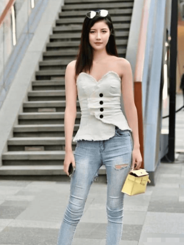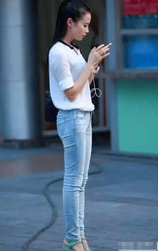 一位娇小可爱的邻家小妹,白色半袖上衣清新自然,牛仔裤紧致修身,搭配在一起显得青春风范十足,脚下的坡跟凉鞋让身材显得亭婷玉立,又不会觉得太累。