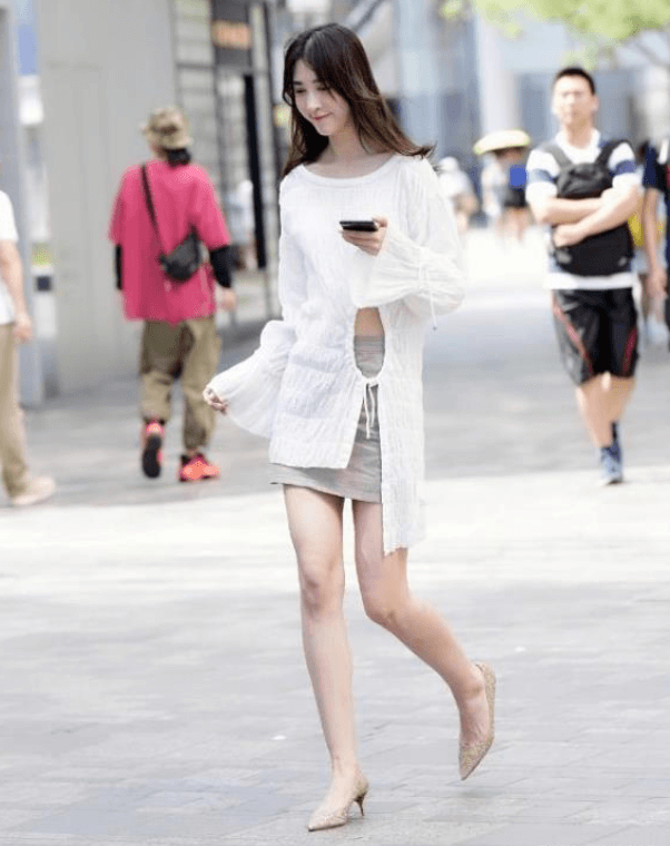 女孩上搭一款休闲时尚白上衣 ,棉麻的面料,袖口荷叶边、腰部镂空系带和衣襟不规则的设计,个性又时尚。