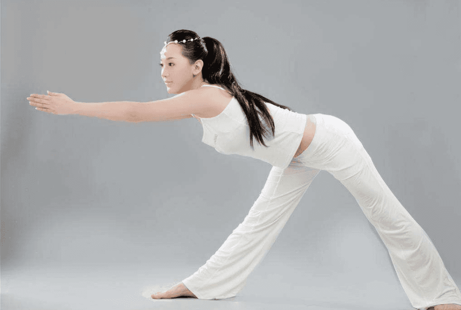 背部延伸,吸气坐正。吐气时,由髋关节带动身体,向前倾45度,延展脊椎和下肢,感觉大腿后侧、后腱肌群的伸展。