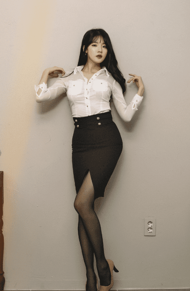 图中的这位小姐姐脚上穿了一双高跟鞋,下身穿了一条黑色的包臀裙。这件裙子有很好的收腰效果,而且看得出来正面开得叉特别高,小姐姐穿着一双黑色的丝袜,站在那里给人一种特别性感的感觉。