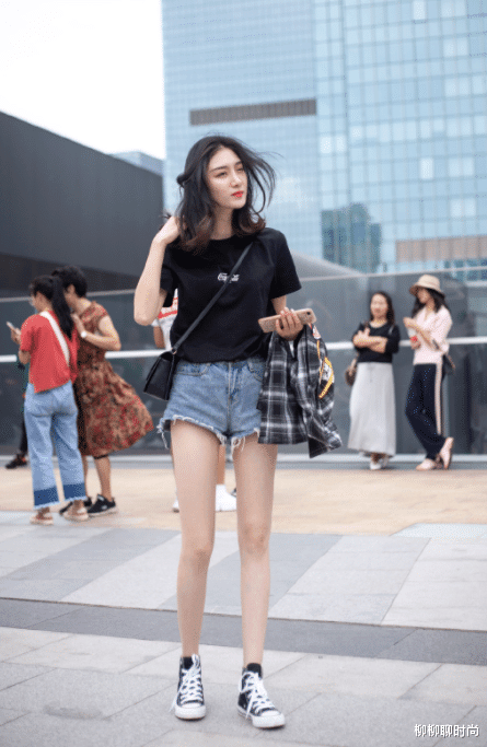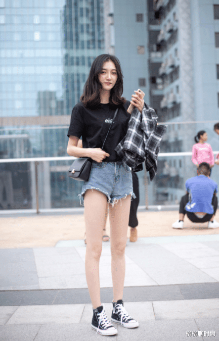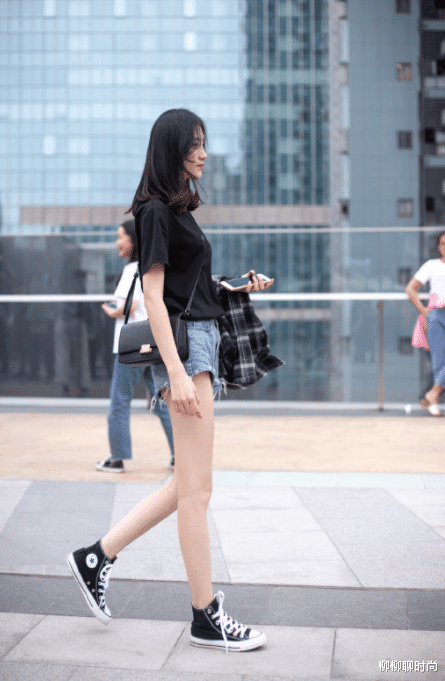 常常细细的长腿搭配一双高帮帆布鞋,绝对的印证了的题目上面的说身材好的女生穿什么都好看,高高长长的大腿,白白的皮肤,难道小哥哥见了这种瘦瘦高高的女生还有抵抗力吗?黑色的上衣搭配一个短短的牛仔裤短裤,我们不得不去想一下,这样的小小姐姐到底会不会出现在校园里或者出现在那种公共的场合里呢?